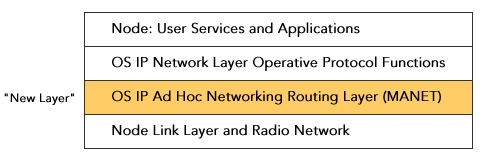 - MANET could be new layer added to the Internet Protocol Suite for implementation.